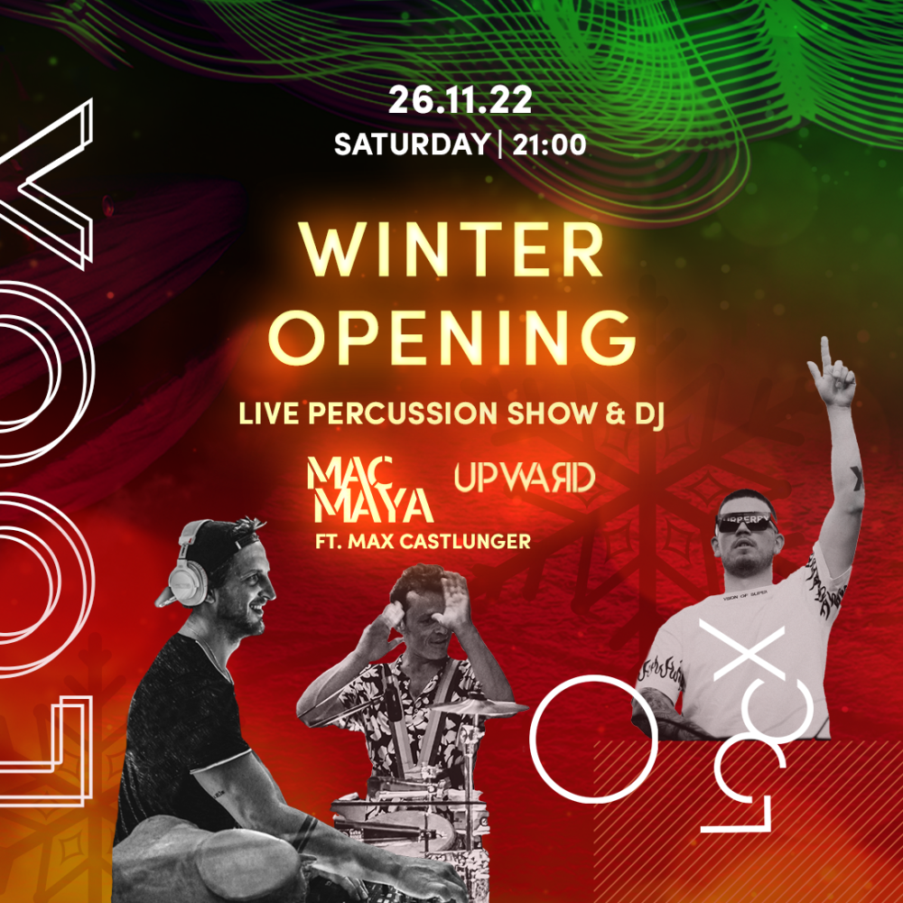 Am Samstag den 26.11. geht es weiter mit der Live Percussion Show von DJ Mac Maya und Max Castlunger im LOOX in Obereggen. Der DJ und Produzent Mac Maya aus Sarntal und der Südtiroler Percussionist Max Castlunger bringen das LOOX mit ihrem speziellen Live Project zum Beben – im wahrsten Sinne des Wortes. Elektronische Dance und House Music gemischt mit rhythmischer Percussion ergeben ein energiegeladenes Zusammenspiel, das mitreißt und bewegt.